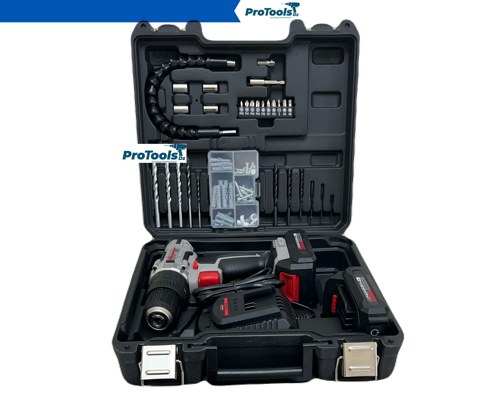 Kit complet Perceuse-visseuse à percussion sans fil 20V – 2Ah, modèle Crown CT21102H-(29). Un outil performant et polyvalent conçu pour le perçage avec percussion et le vissage intensif. Ce pack inclut un ensemble de 29 accessoires indispensables pour tous vos travaux de bricolage et de maintenance professionnels.